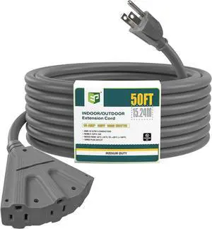 EP 50 Ft Outdoor Extension Cord with 3 Electrical Power Outlets - 16/3 SJTW Grey Cable with 3 Prong Grounded Plug for Safety Great for Christmas Lights, Garden and Major Appliances