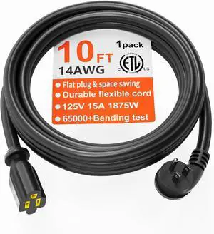 HUANCHAIN 14 Gauge 10 FT Flat Plug Extension Cord Black Indoor Outdoor, Heavy Duty 3 Prong Grounded Low Profile Extension Wire Flexible, 15A 1875W 125V 14AWG SJTW, ETL Listed