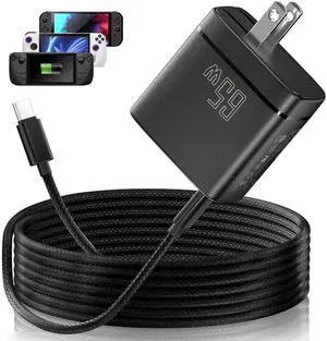 65W AC Charger for Nintendo Switch 2, Supports TV Mode, with Foldable US Plug & 5FT Cable, GaN PD Fast Charging for Steam Deck, ROG Ally, iPhone 17/16/15, Tablet & Laptop - Black