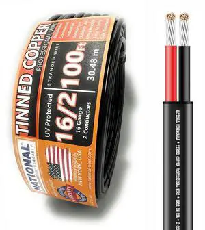 National Wire&Cable - 16/2 Tinned Copper Professional Wire (100 Feet) 16 AWG Gauge Stranded PVC Cord - 2 Conductor Electrical Wire - Made in USA - CL Rated/ETL Listed - LED Light, Low Voltage Cable