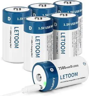 D Batteries Rechargeable with 4 in 1 USB C Charging Cable D Size Cell Lithium Batteries 7500mWh 1.5V for Flashlights, Toys, and Floodlights (6 Pack, D Battery)