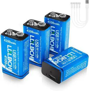 Rechargeable 9V Lithium Batteries 4100mWh with 4-in1 Charging Cable - 6F22 9 Volt Batteries 4 Pack, Over 500 Cycles, for Smoke Detector Alarms, Microphones, Guitar