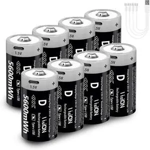 D Batteries Rechargeable 8 Pack with4 in 1 USBC Charging Cable D Size Cell Lithium Batteries 7500mWh 1.5V for Flashlights, Toys, and Floodlights