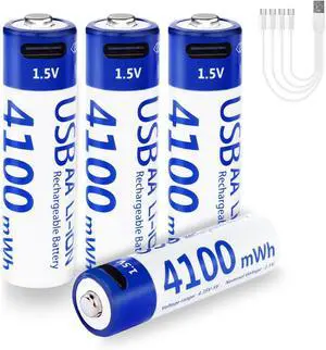 Rechargeable AA Lithium Batteries with USB-C Charging, 4-Pack 1.5V 4100mWh High-Capacity Double A Batteries 1300 Cycles for Toy, Xbox, Smart Door Lock