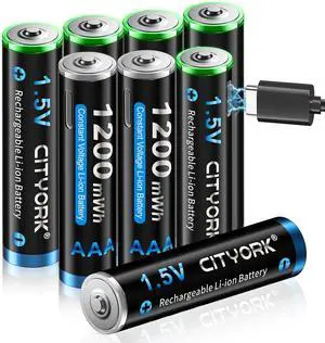 CITYORK Type-C USB 1.5V 8 Pack AAA 1200mWh Lithium Rechargeable Battery, 1.5V Constant Output, 2H Fast Charging Triple A Batteries, LED Charging Indicator (Include 2 * 4 in 1 USB Cable)