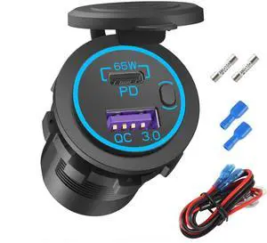 Boostable 12V USB C Outlet 65W PD3.0 Port and 18W Quick Charge 3.0 Car USB Charger Socket for Laptops Tablets Phones, Waterproof 12V/24V Socket with Power Switch for Car Marine Boat Motorcycle RV