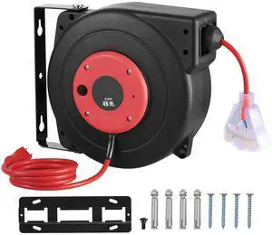 VEVOR Retractable Extension Cord Reel, 45 FT, Heavy Duty 12AWG/3C SJTOW Power Cord, with Lighted Triple Tap Outlet, 15 Amp Circuit Breaker, 180° Swivel Bracket for Ceiling or Wall Mount