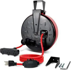 SuperHandy Extension Cord Reel Retractable 12AWG x 80' Foot 3C SJTOW Cable Triple Tap Connector Power Rating 125 Volt AC 15 Amp 1875 Watt Industrial Steel Single Arm