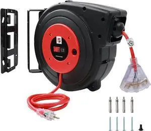 VEVOR Retractable Extension Cord Reel, 45 FT, Heavy Duty 12AWG/3C SJTOW Power Cord, with Lighted Triple Tap Outlet, 15 Amp Circuit Breaker, 180° Swivel Bracket for Ceiling or Wall Mount