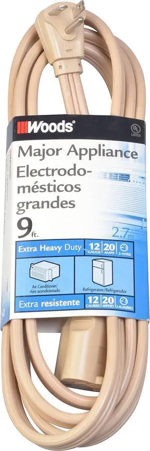 Woods Major Appliance Extension Cord - 12/3 Gauge SPT-3 - Right Angle Plug for Tight Spaces - Compatible with 250V 20A Appliances - Designed for Major Home Use - Beige Cord - 9 Feet