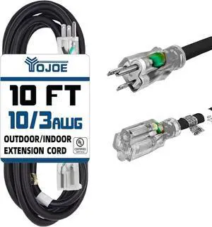 YOJOE Indoor Outdoor Extension Cord with Lighted End, 3 Prong 15A Weatherproof Power Cord, 10 Gauge Heavy Duty 10 ft Black Extension Cord for Garage, Garden and Home, 10/3 SJTW UL Listed