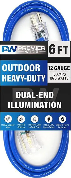 6 ft - 12 Gauge Heavy Duty Extension Cord - Lighted on Both Ends - SJTW Blue - Outdoor Extension_Cord Waterproof 6 ft by Premier Wire - 15 Amp ExtensionCord (6 Foot 12-Awg Power Cord Blue)