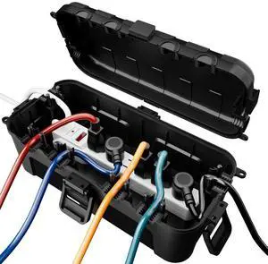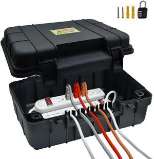 Outdoor Electrical Box, IP54 Weatherproof Extension Cord Cover with 6 Cable Entry Ports, Waterproof Connection Box Protect Power Strip, Timer, Plug, Holiday Lights, (11.5x5.2x4 inch), Black