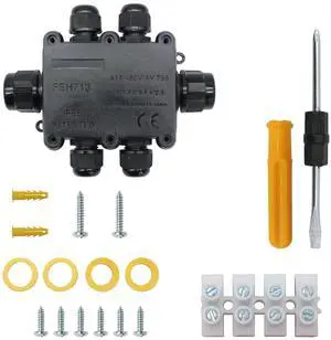 Waterproof Junction Box Outdoor, IP68 6-Way, Black, PA66 Nylon, Includes 4 Sets of Waterproof Rubber Plugs