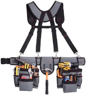 Tool Belt, 22 Pockets Tool Pouch with Suspenders for Men, Heavy Duty Adjustable Utility Belt Bag Suspenders for Electrician, Carpenter, Construction, Work Apron Organizer Waist Adjust 32 to 68in
