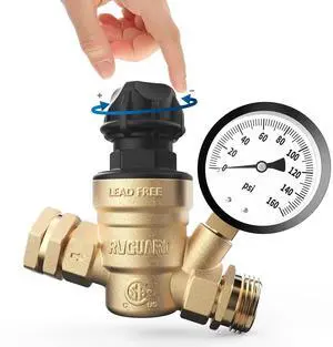 Water Pressure Regulator Valve, Brass Lead-Free Adjustable Water Pressure Reducer with Gauge and Inlet Filter for RV Camper and Travel Trailer