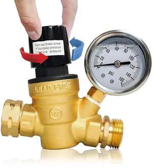 Water Pressure Regulator Valve With An Adjustable Knob, Tool-Free, CSA Approved, Lead-Free Brass Water Pressure Reducer with Gauge and Inlet Screen Filter for RV Camper Travel Trailer