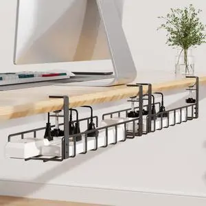 2 Pack Cable Management Under Desk Tray, 31.4" No Drill Under Desk Wire Management with Upgraded Clamp, Metal Cord Organizers for Desk with Cable Organizers, PC Cable Management Rack, Black