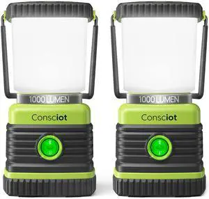 Consciot LED Battery Powered Camping Lantern, 1000LM, 4 Light Modes, IPX4 Waterproof Portable Tent Flashlight for Power Outages, Emergency, Hurricane, Hiking, Light Green, 2-Pack