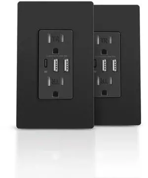 3-Ports USB Wall Outlet, 30W 6.0A Electrical Outlet, Tamper-Resistant with USB C Ports, 20 Amp Duplex Tamper Resistant, Screwless Plate Include, UL & FCC Listed, Black, 2 Pack