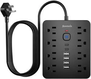 Surge Protector Power Strip 10FT Extension Cord with 12-Outlet 4 USB-A & 2 USB-C Ports, 1850W/15A, Flat Plug, Wall Mountable ETL Listed for Home, Dorm Room