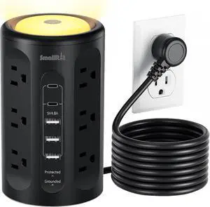Surge Protector Power Strip Tower with 5 USB Ports and Night Light,10FT Extension Cord with 12 AC Multiple Outlets (Black, 10FT)