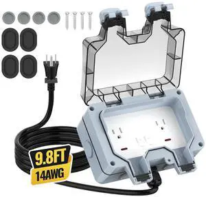 Outdoor Outlet Box with 9.8Ft Extension Cord, NEMA 5-15R, IP66 Waterproof Outdoor Outlet Box w/Lockable Cover & LED Indicator (Double Plug Socket) - Perfect for Gardens, Yards & Sports Fields