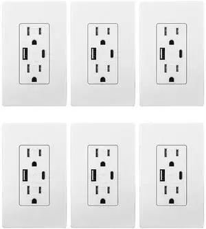 USB Outlets, 30W 6.0 Amp USB C Outlets Receptacles, 3-Port USB Wall Outlet, 20 Amp Tamper-Resistant Outlet with 2 USB C Ports, UL Listed, Screwless Wall Plate Included, 6 Pack, Matte White