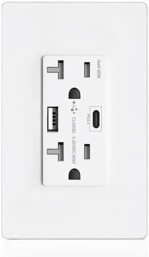 USB Wall Outlet, 65W GaN 6.0A USB Outlet Receptacles with 2 USB Ports,20 Amp Tamper-Resistant Electrical Outlet with 1 Type A&1 Type C,Screwless Wall Plate Included,UL Listed