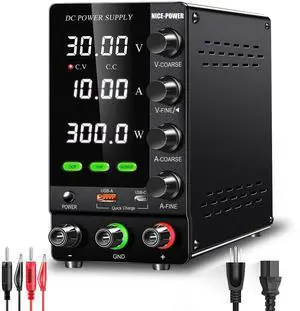 DC Power Supply Variable: 30V 10A Adjustable Switching Regulated High Precision 4-Digits LED Display 5V/2A USB Port Test Lead Output & Input Power Cord Bench Lab Power Supplies
