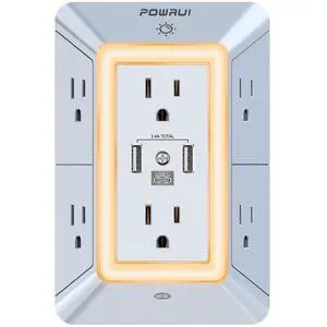 USB Wall Charger, Surge Protector, 6-Outlet Extender with 3 USB Charging Ports (1 USB C) and Night Light, 3-Sided Power Strip with Adapter Spaced Outlets - WhiteETL Listed, Gray