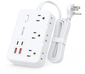 Surge Protector Power Strip with Flat Plug, 5 FT Extension Cord with 6 AC Outlets 4 USB Ports(2 USB-C),1050J Surge Protection, Wall Mountable Charging Station for Office, Home, White