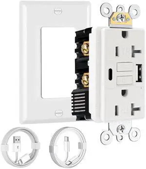20 Amp GFCI Outlet with USB-C & USB-A Ports and Cables, Self-Test GFCI Electrical Outlet, Tamper-Resistant, Screwless Wall Plate Included, Thinner Design GFCI USB Outlet, ETL Listed, White, 1-Pack