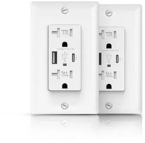 2Pack USB Charger Wall Outlets, 20A Receptacle with Dual Type C & A Ports, 6.0 Amp 30W Tamper Resistant Receptacle Plug, Wall Plate Included, ETL & FCC Listed, White