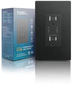 TOPELER GaN 65W USB C Wall Outlet Receptacle for Laptop, 15A Standard Electrical TR Receptacle, Screwless Wallplate Included, Commercial and Residential Use, ETL&FCC Listed, Black