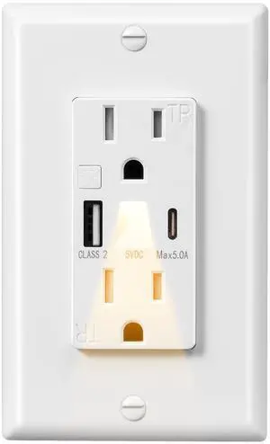 USB Outlet with LED Night Light, 5V 4.8A Tamper-Resistant Wall Outlets with USB-A & USB-C Ports, Wall Plate for Kitchen, Bathroom, Office, White