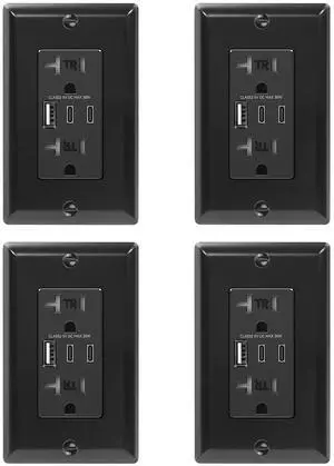 ECOELER Black USB Receptacle, 20A Duplex Tamper-Resistant Receptacle with Type-A & Type-C Charging Ports, 6.0 Amp 3-Ports USB Electrical Power Socket, Wall Plate Included, UL Listed, 4 Pack