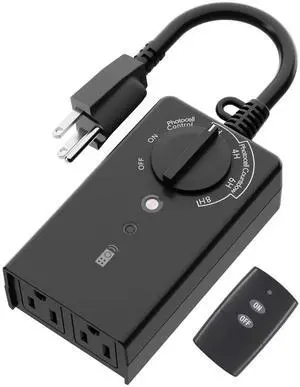 Outdoor Light Timer, Waterproof Plug-in Dusk-to-Dawn Controller with 3 Grounded Outlets for Christmas & Halloween String Lights, 15A 1/2HP, ETL Listed, 100 ft RF Range, Remote Included