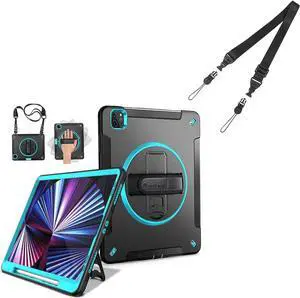 Case for iPad Pro 11 Inch 2024 (5th Gen) with Screen Protector, Heavy Duty Rugged Proective Case Cover with Shoulder Strap/Pencil Holder/Handle/Rotating Stand, Blue