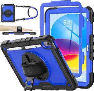 Case for iPad (A16) 11th/10th Generation 11''/10.9'' 2025/2022, Full-Body Drop Protection Case with Screen Protector &360° Rotate Hand Strap/Stand, Blue+Black