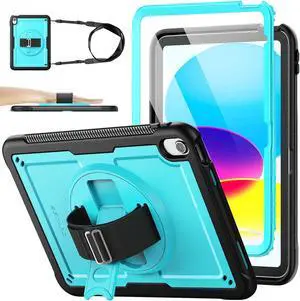 Case for iPad A16 11-inch Case 2025/ for iPad 11th/ 10th Generation 10.9'' 2022, Protective with Screen Protector, Pen Holder, Rotate Stand, Loop Nylon Hand Strap, Shoulder Strap, Cyan