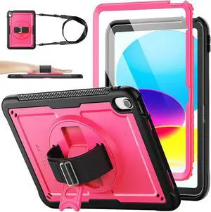 Case for iPad (A16) 11th/10th Generation 11''/10.9'' 2025/2022, Full-Body Drop Protection Case with Screen Protector &360° Rotate Hand Strap/Stand, Pink+Black