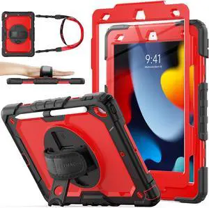 Case for iPad 9th/ 8th/ 7th Generation 10.2'', Shockproof with Screen Protector, Pencil Holder [360° Rotating Hand Strap] & Stand, for iPad 10.2 inch 2021-2019 (SiliconeRed+Black)