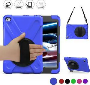for iPad Mini 4 Case Three Layer Drop Protection Shockpoof Rugged Heavy Duty iPad Mini 4 Protective Case With a 360 Degree Swivel Stand Hand Strap and a Shoulder Strap for iPad Mini 4 Case Blue