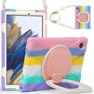 PboyiqiS Case for Galaxy Tab A8 10.5" 2022 (SM-X200/ X205/ X207), Heavy Duty Protective Case with 360 Degree Swivel Stand&Hand Strap&Shoulder Strap (Colourful Pink)