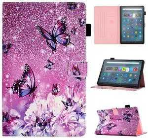UUcovers Fire HD 10 2019/2017/2015 Case 9th/7th/5th Generation 10.1", Slim Folio Stand Wallet with Pencil Holder Elastic Band [Auto Sleep/Wake] Embossed PU Leather Cover, Flower Butterfly Blue