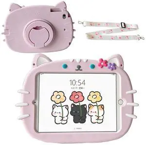oleaumfilter for Samsung Galaxy Tab A7 10.4 Inch Case 2022/2020(SM-T500/T505/T507) with 360 Rotating Handle Stand Strap Cute Kawaii Flower Cat Silicone Protective Tablet Cover for Kids Girls-Pink