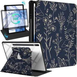 Wazzasoft for Samsung Galaxy Tab S7/S7 Plus/S8 Plus Case - 12.4 Inch Folio Cover with Pencil Holder - Women/Girl Cute Girly Black Flower Unique Design - Rotating Tablet Case