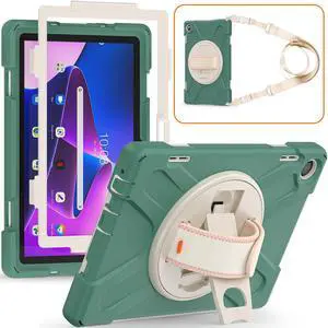 Case for Lenovo Tab M10 3rd Gen 10.1 inch 2022 Model TB-328FU TB-328XU with Pencil Holder, Kickstand, Hand & Shoulder Strap Shockproof Protective Cover Dark Green