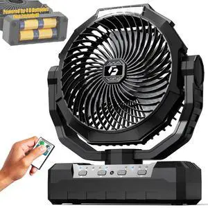 Battery Operated Fan [200H Max], 2 in 1 D-Cell Battery & USB Powered Fans, Portable Camping Fan with 4 Speeds, Light, Timer, Remote for Outdoor Tent, Travel, Picnic, Office, Bedroom - Black
